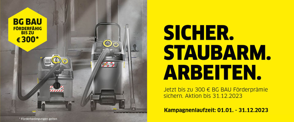 Aktionszeitraum: 01.01. - 31.12.2023 Mit Sicherheitssaugern der Staubklasse M und H sind unsere Kunden auf Baustellen bestens vor lungengängigen Feinstäuben geschützt. Beim Kauf eines M- oder H-Entstaubers gibt es bis zu 300€ BG Bau Förderprämie*.