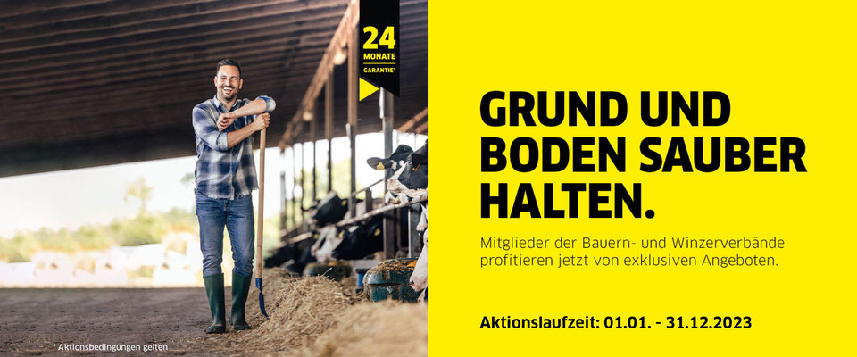 Aktionszeitraum: 01.01. - 31.12.2023 Grund und Boden sauber halten. Diese robusten Reinigungsgeräte entsprechen perfekt den Anforderungen der Zielgruppe Landwirtschaft. Als Mitglied des Bauern- und Winzerverbände erhalten Sie jetzt exklusive Rabatte auf unsere speziellen Reinigungslösungen. Sichern Sie sich Ihren Preisvorteil auf Hochdruckreiniger, Nass-/Trockensauger, Melkstandreiniger. und Silosauger.**